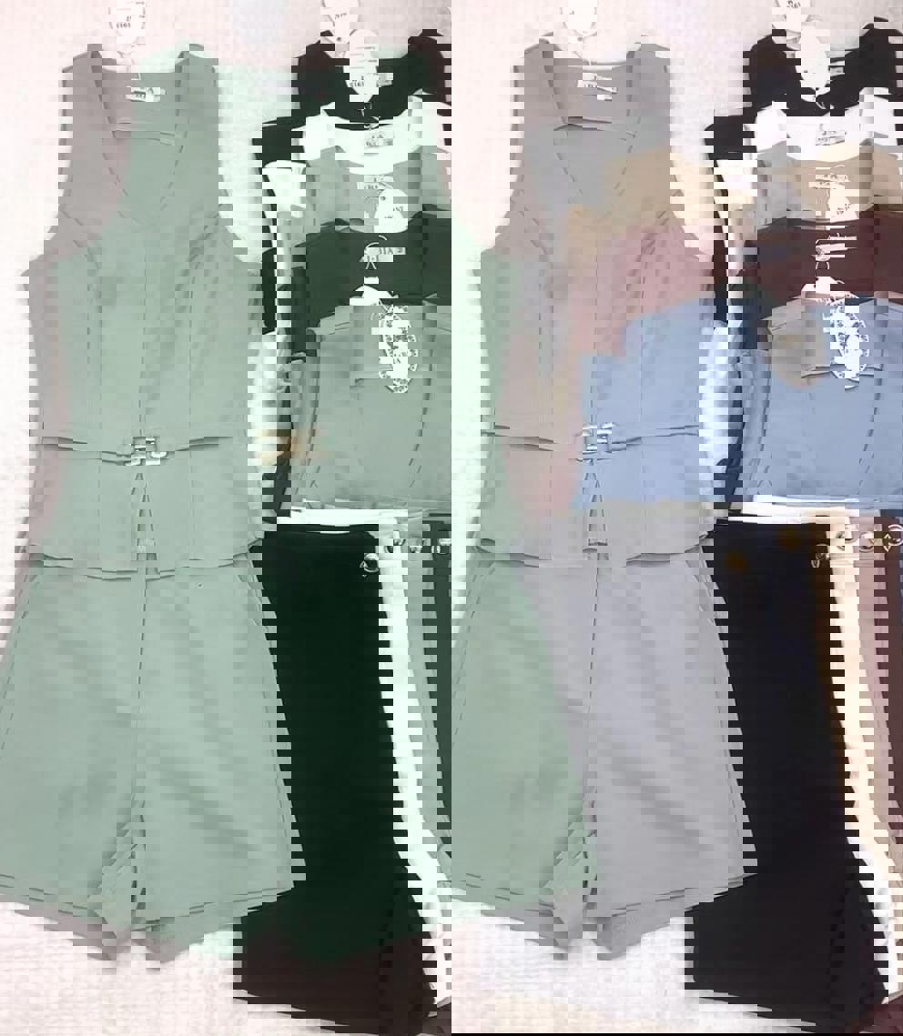 Conjunto em alfaiataria moderna, composto por regata sem mangas com decote em V e fechamento frontal por fivela metálica, e shorts de cintura alta com caimento estruturado e elegante.